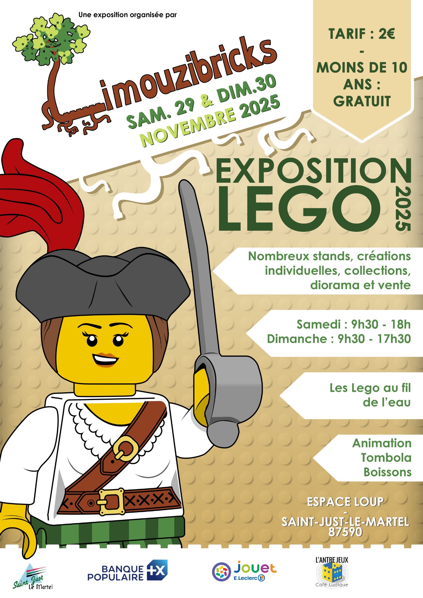 Limouzibricks : exposition de LEGO 29 octobre 2025admin-commune-saint-justComments (0) L’association Limouzibricks organise la deuxième édition de son exposition de LEGO les 29 et 30 novembre 2025 à l’espace Loup.Entrée 2 €, gratuite pour les moins de 10 ans.Animations, tombola, boissons sur place.